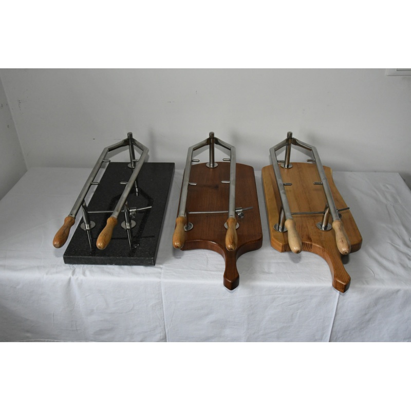 A termék újdonsága a prosciutto préselésénél történő egyszerű rögzítés, csavaros rendszerű esztergált elemmel.