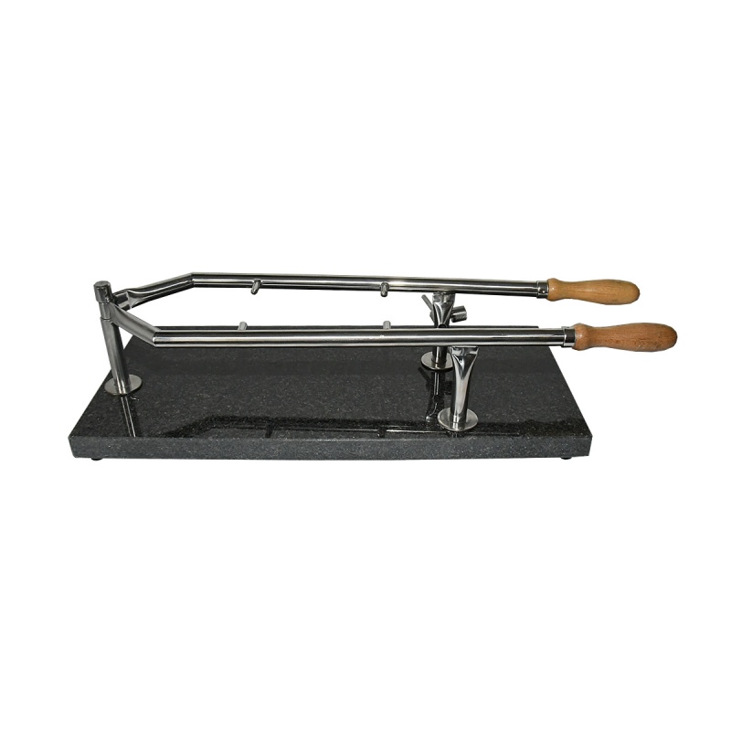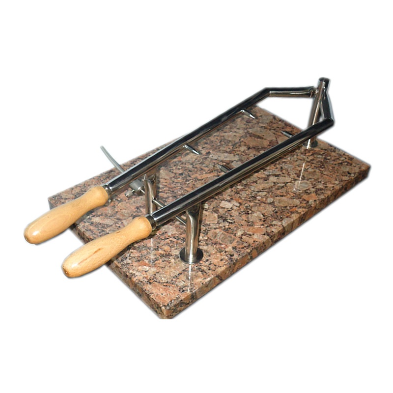 A rozsdamentes acél elem fa fogantyúkat és mindkét oldalon 2 tüskét is tartalmaz.