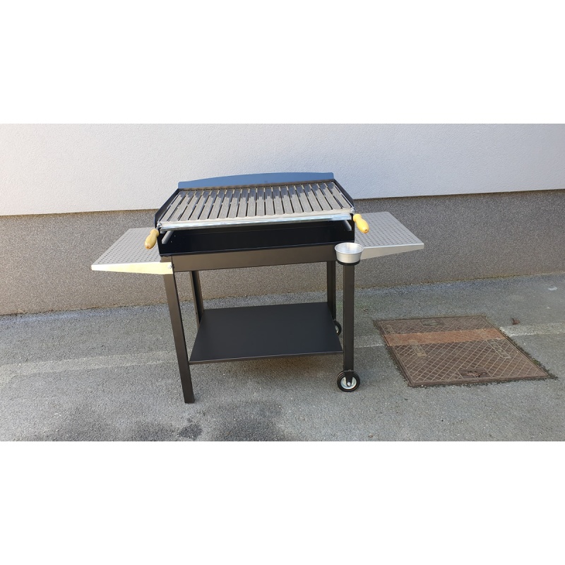 Standard grillrács INOX keresztrúddal 1,5 mm vastag - 5 mm vastag kerettel és fa fogantyúkkal az elején. A DELUXE modell extra erős vas tűztere (2 mm vastag) - teljes egészében AWI-hegesztéssel és lézervágott elemekkel - garantálja a legmagasabb használati minőséget.