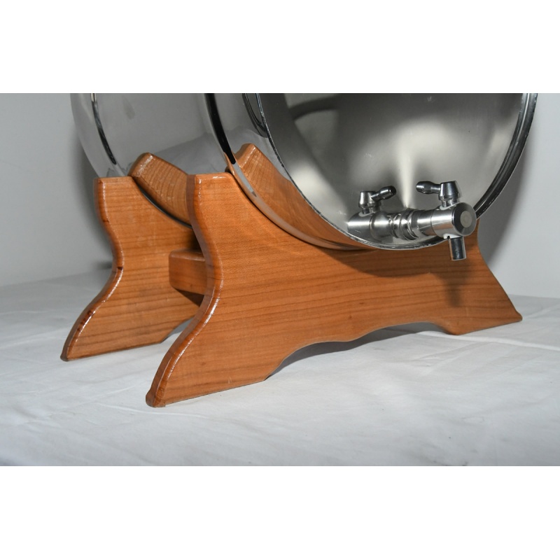 ROZSDAMENTES ACÉL hordó fa állványon bornak, pálinkának, olajnak és hasonlóknak. Űrtartalom 20 liter. Rozsdamentes acél csappal és esztergált hermetikus csavarral gumiszalaggal.