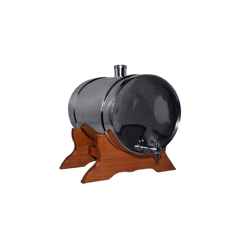 ROZSDAMENTES ACÉL hordó fa állványon bornak, pálinkának, olajnak és hasonlóknak. Űrtartalom 30 liter. Rozsdamentes acél csappal és esztergált hermetikus csavarral gumiszalaggal.